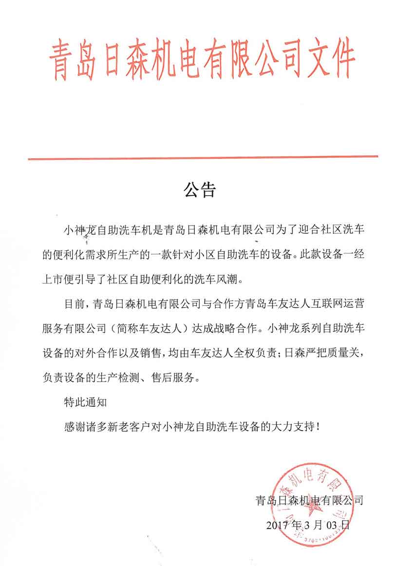 關于車友達人合作小神龍自助洗車機的公告